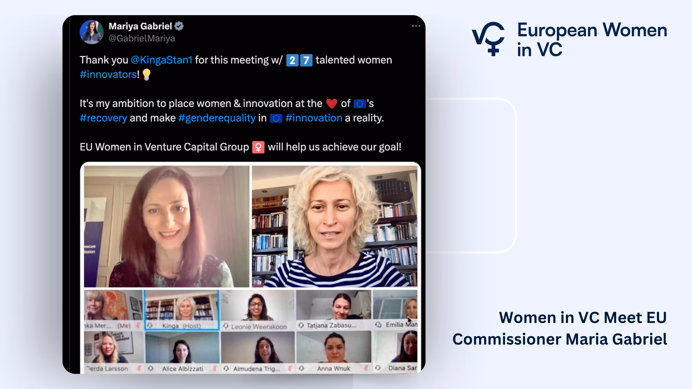 Kinga Stanisławska, Managing Partner & Founder of Experior Venture Fund & co-founder of European Women in VC and Laura González-Estéfani, Founder & CEO of The Venture City, and member of European Women in VC met with Maria Gabriel, the Commissioner for Innovation, Research, Culture, Education and Youth. The meeting was the first of a newly established working group, led by Commissioner Gabriel, that brought together 23 senior professionals and representatives from the EU Member States to work towards a more inclusive and gender-balanced innovation ecosystem, where creativity and diversity flourish.