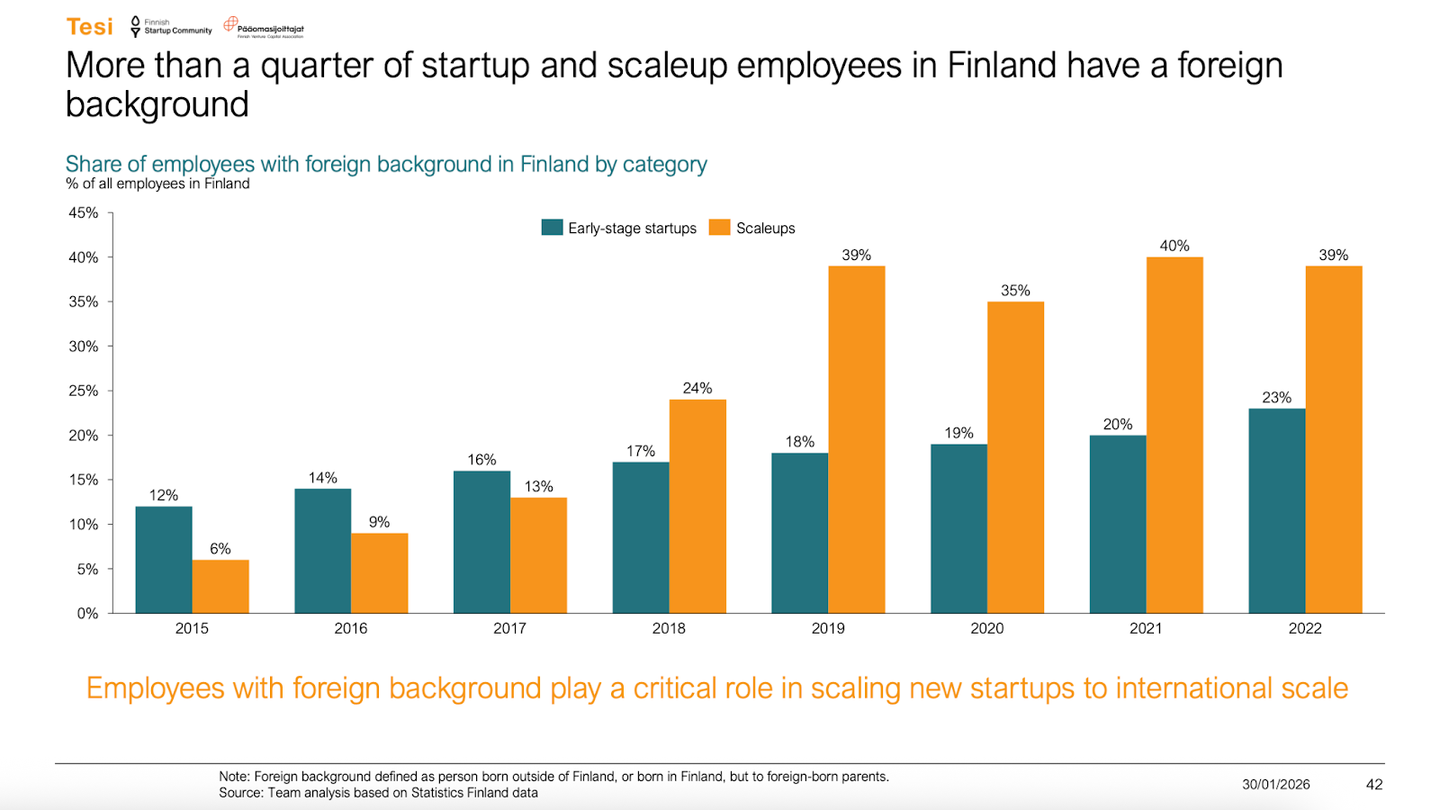 But Finland is making progress. Per a report produced by Tesi, more than a quarter of startup and scaleup employees in the country have a foreign background — and they play a key role in helping companies scale internationally. Compared to its European counterparts, Finland doesn’t have buckets of private wealth. But Wendelin is seeing the flywheel effect already permeating the country’s tech ecosystem.
